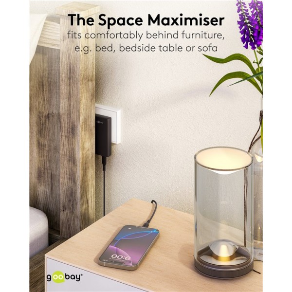 Une fois branché à la prise, le chargeur USB-C™ est à peine plus profond qu'une plinthe et donc extrêmement peu encombrant, ce qui le rend idéal dans les espaces restreints, p. ex. derrière les tables de chevet et autres meubles
