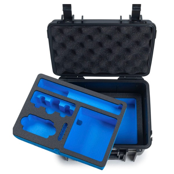 INTÉRIEUR : Valise avec un insert en mousse noire et bleue pour la DJI Osmo Action 6 et ses accessoires. La mousse du couvercle assure un maintien optimal : robuste, parfaitement ajustée et idéale pour le transport.
