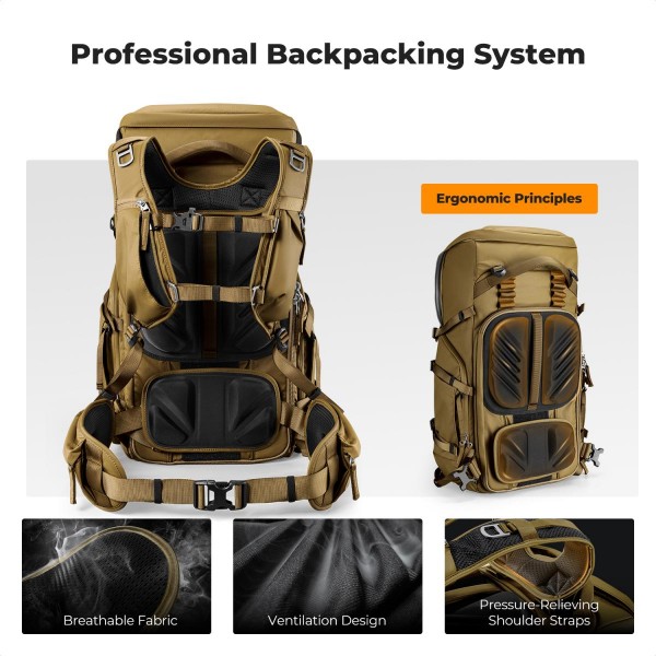 • Conçu selon les normes des sacs à dos de trekking professionnels, il est doté d'un système de harnais triplement réglable (hauteur des épaules, sangle de poitrine, ceinture) pour s'adapter à toutes les morphologies. Cette conception ergonomique répartit efficacement les charges lourdes, réduisant ainsi considérablement la fatigue lors des longues missions de photographie et de trekking en extérieur.