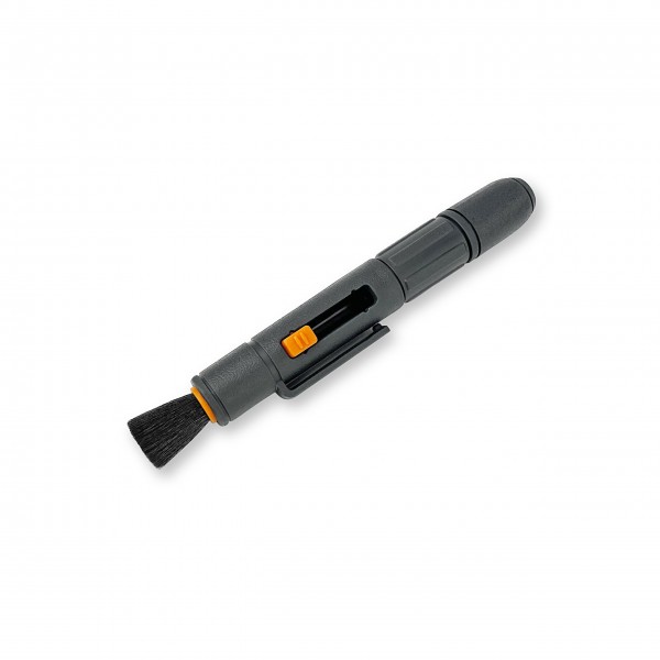 Le nettoyeur d'objectif C6® comprend également une brosse rétractable pour enlever la poussière et les débris.