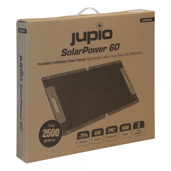 Panneau solaire puissance de sortie maximale 60 Watt avec une efficacité de conversion de ≥21%. 2 ports USB-A et USB-C intégrés.