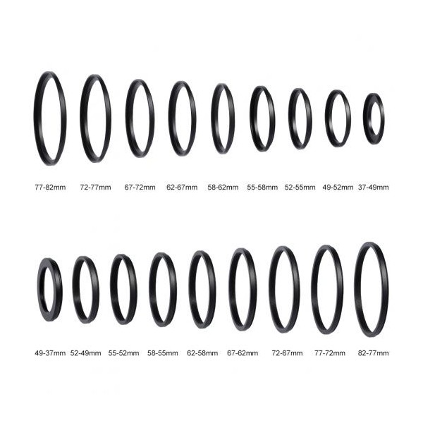Comprend 9 bagues adaptables (37-49, 49-52, 52-55, 55-58, 58-62, 62-67, 67-72, 72-77, 77-82 mm)